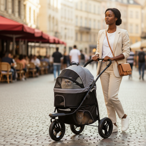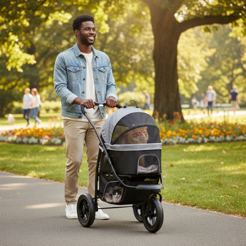 Poussette 3 en 1 pour animaux avec sac de transport amovible et grand espace de rangement. Idéale pour les promenades longues ou en ville, elle offre confort, sécurité et praticité grâce à son design robuste et ses grandes roues adaptées à différents terrains.