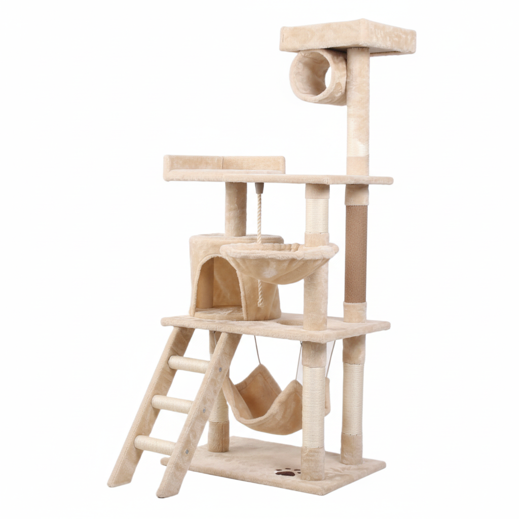 Structure multi-niveaux avec : 1 maisonnette fermée pour se cacher et dormir, 1 hamac suspendu pour la détente, 1 échelle d’accès ludique, 2 plateformes d’observation, 1 tunnel perché pour explorer, Plusieurs poteaux recouverts de sisal pour l’entretien des griffes